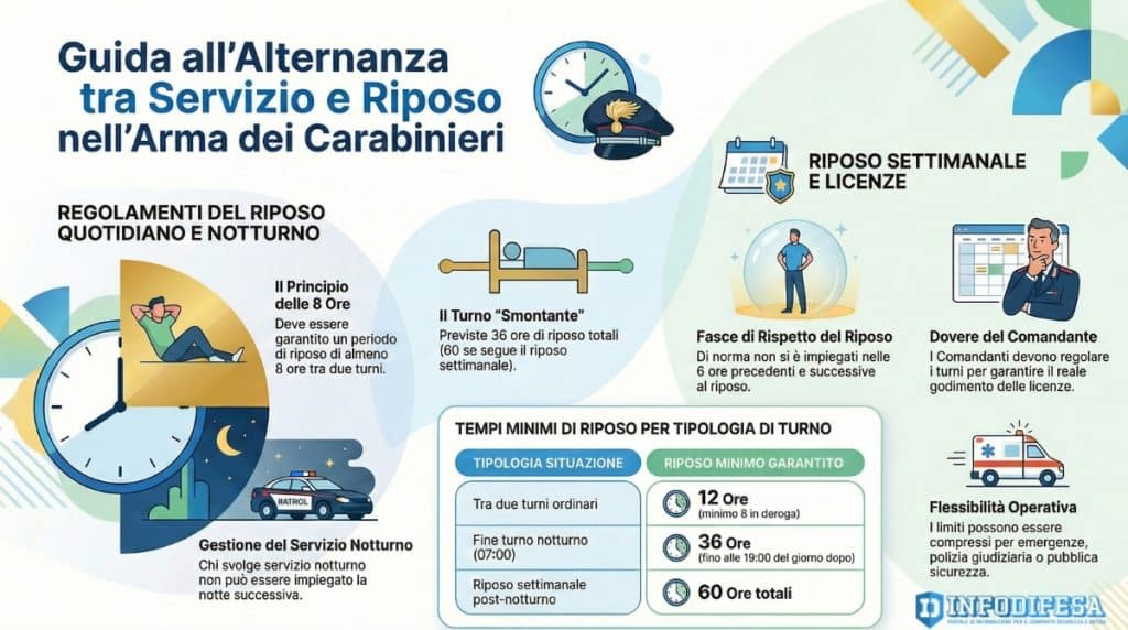 - Dopo un servizio notturno, il militare non può essere impiegato la notte successiva, né può riprendere servizio prima che gli sia garantito un periodo di riposo “aggiuntivo” rispetto all’orario di inizio delle attività mattutine, pari alla durata del servizio svolto dopo la mezzanotte.