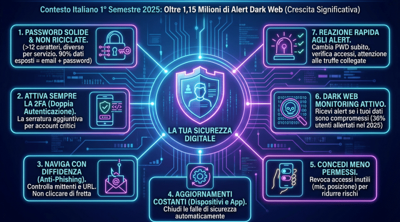 Sembra banale, ma è ancora il punto debole numero uno. Nel 2025, oltre il 90% dei dati esposti sul dark web nel nostro Paese includeva la classica accoppiata “email + password”. Questo succede soprattutto perché la stessa password viene riutilizzata ovunque.